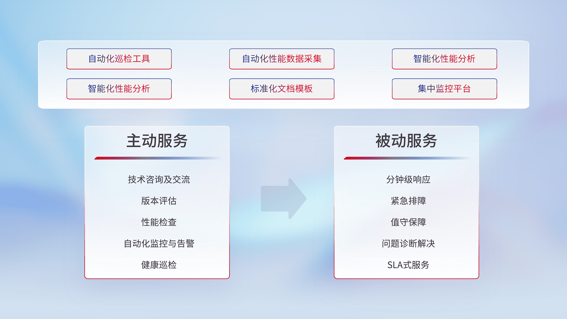 智能化工具和标准化文档,,,,保障服务质量,,,,提供主动服务(包含技术咨询、、、、版本评估、、性能检查、、自动化监控与告警、、、健康巡检)和被动服务包含(分钟级响应、、、紧急排障、、、、值守保障、、、问题诊断解决、、、SLA服务)。。。。